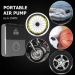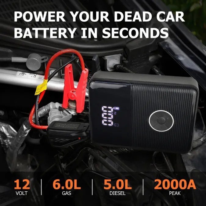 Booster batterie multifonction 2000A avec gonfleur intégré, power bank 21800mAh et torche LED. Démarre moteurs essence/diesel jusqu’à 8L, gonfle pneus jusqu’à 150 PSI, charge USB rapide. Idéal pour urgences auto, voyages et camping, portable avec pochette.